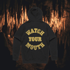 Watch Your Mouth Zip Hoodie in black with front and back print.
